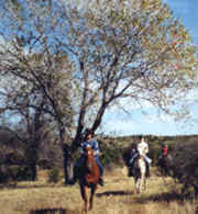 for miles of riding over trails and cattle feedroads traversing 10,000 acres with your own cowboy guide. Stay at Cottonwood Mott, the historic line camp owned for 69 years by the Scottish syndicate's Matador Land & Cattle Co., Ltd. of Forfarshire, Scotland. A nearby bunkhouse with present-day conveniences sleeps six comfortably, with Cowboy teepees also available. Rates vary according to needs and steeds, but generally start at $50 a day.  |